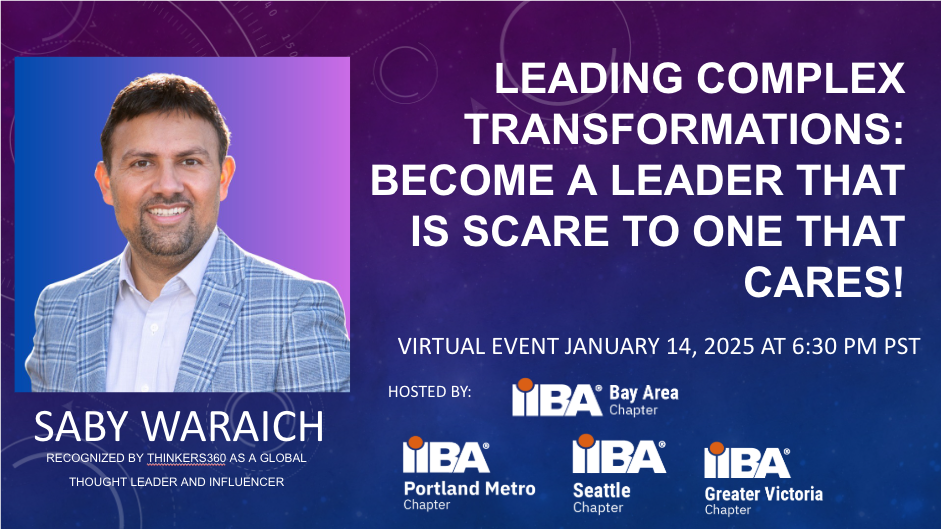 In the dynamic world of organizational leadership, the ability to navigate and lead through complex transformations is critical. Saby Waraich, a seasoned leader with extensive experience in technology and change management, offers an insightful session designed to empower leaders to evolve from a mindset of fear and control ("SCARE") to one grounded in empathy, trust, and collaboration ("CARES"). Hosted by the Portland Metro IIBA.